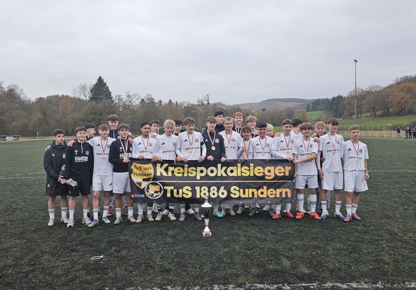Eindrucksvoll mit welcher Regelmäßigkeit die U17 jetzt zum 6 Mal in Folge den Kreispokal geholt hat. Etwas unruhig war es nur vor dem Spiel. Der Spielverlauf war über gesamten 80 Minuten sehr einseitig, kam die JSG Bruchhausen/Hüsten/Niedereimer zu keinem Torabschluss. Einzig die Torausbeute gegen leidenschaftlich kämpfende Spieler blieb etwas unter den Erwartungen. Auch wenn das Ergebnis im „normalen Rahmen“ blieb, hat man doch gesehen, welch guten Ball unsere Jungs spielen. „Technisch sah das schon gut aus, auch wenn die Spannung etwas fehlte.“, so das Trainerteam