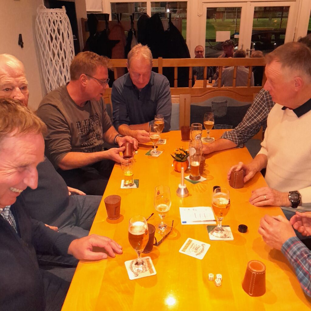 Sehr laut war es allerdings auch beim Knobeln. An zwei Tischen wurde geschockt was das Zeug hielt. Goldhand Manni Lübke zeigte zwar hin und wieder sein Können, schaffte es aber nicht ins Finale. Horns Werner wurde mehrmals beim Mogeln erwischt, was ihm aber letztendlich auch nichts nützte. So standen Michael Zimmer und Franz Hellmann im Finale – Franz war Sieger des Turniers. Der 3. Platz konnte leider nicht ausgespielt werden, da Moped von jetzt auf gleich verschwunden war und somit war Jürgen Bürger 3. Sieger.