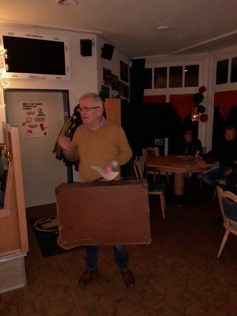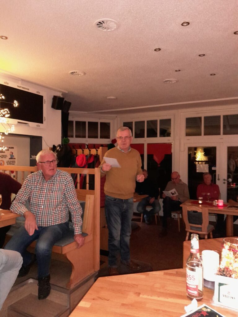 Und wie jedes Jahr wurden hierzu die Westenfelder Altherren-Freunde eingeladen, die diese Einladung wieder sehr gerne angenommen haben. So trafen sich insgesamt 40 Oldies im Clubheim. Erstmal wurde der leckere Grünkohl gegessen und dann – damit hatte wirklich keiner gerechnet – kamen doch tatsächlich der Nikolaus und sein Knecht Ruprecht zu Besuch. Der Nikolaus war gut vorbereitet, und so wurden 28 der anwesenden Oldies namentlich aufgerufen. Zu jedem konnte er lustige Geschichten vortragen. Dabei wurden auch die Westenfelder Freunde nicht verschont. Knecht Ruprecht hatte viel zu tun und musste dementsprechend seine Rute einsetzen. Nachdem sich der Nikolaus verabschiedet hatte, warteten alle gespannt auf Julles Auftritt.Traditionsgemäß trug er sehr emotional ein Weihnachtsgedicht vor – einfach klasse! Typisch Julle! Anschließend verteilte Jupp endlich die Liederhefte. Kobolt holte seine Trompete hervor und es wurden alle bekannten Weihnachtslieder laut und kräftig gesungen. Manch ein Gesangverein wäre froh, solche Sänger zu bekommen. Natürlich wurde auch die Clubheimwirtin Gitti nicht vergessen. Sie erhielt ein eigenes Ständchen „In Gittis Kneipe ….“